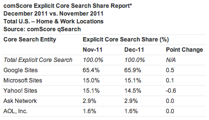 comScore has released its search data for December 2011, and Google continues to dominate in terms of share, with 65.9%, compared with 65.4% in November 2011 and 66.6% in December 2010. Year-over-year, queries increased 9.7% in December.