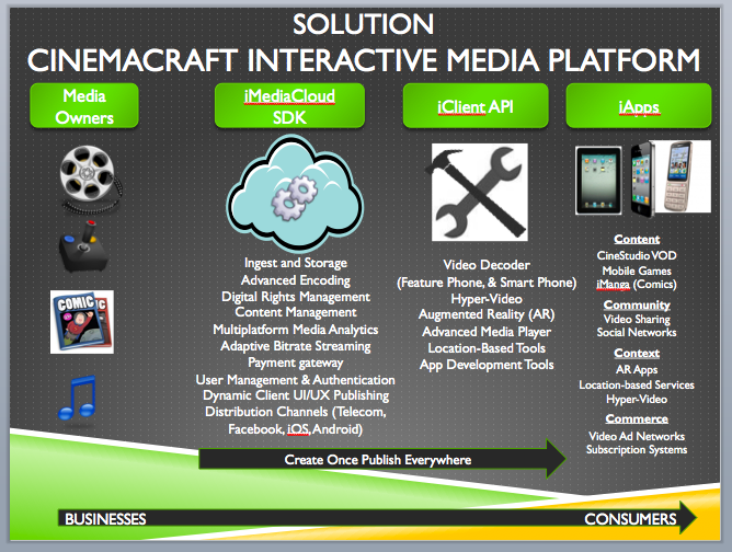 In other words, Cinemacraft wants to enable even owners of low-end phones in mobile markets with weak bandwith and latency issues to consume content such as movies, TV programs, music, games, comics, or interactive video ads on their handsets. (Again, smartphones like the iPhone or iPad, Android, Windows Phones, or Blackberry are supported, too.) The ultimate goal is a unified interactive media platform that overcomes the fragmentation problem observed in the mobile world today.