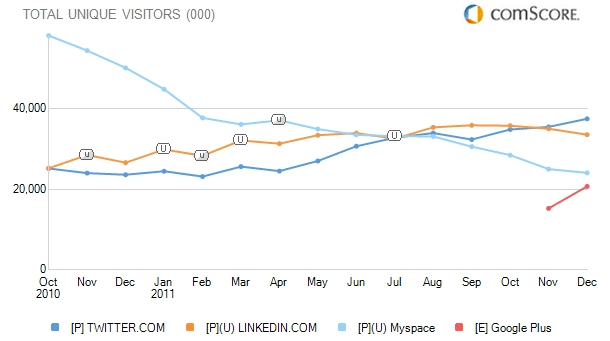 What about Google’s big new, heavily promoted social network, G+? It has gone from 15.9 million uniques in November to 20.6 million last month. ComScore’s December worldwide numbers aren’t out yet, but going by the November ones, G+ seems to be on the up and up everywhere.