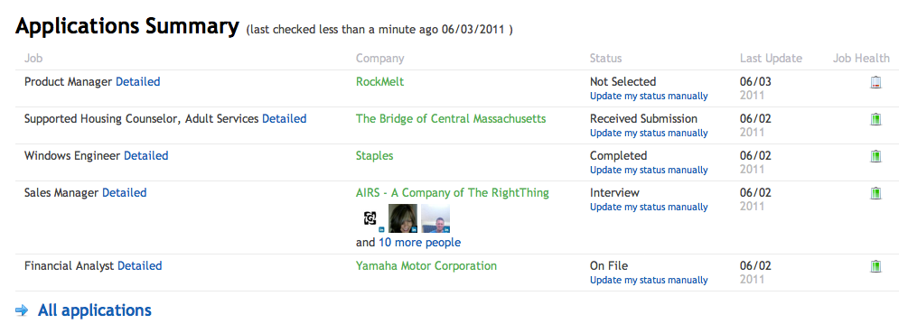 This too is free, and works with any company job searchers apply to, even if you applied through other websites — all you have to do is give permission for the service to track your applications. If companies don’t provide online status updates, searchers can do so manually on the site. StartWire then organizes all of your applications in one place, labeling each as “active”, “stalled”, or “no longer in the running”, sending you updates in daily emails or texts.