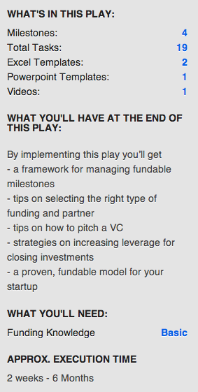 StartupPlays really does offer a great alternative, and a great complement to sites like TheFunded.com. It’s all about giving entrepreneurs the resources they need to execute on their ideas, and with virtual workplaces that offer task and check lists and document templates and center around specific projects, it can save you from wasting time researching and plotting and get you into execution.