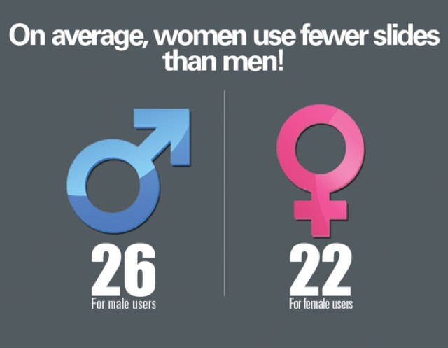 - Women use fewer slides on average (22 per slideshow) than men (26).