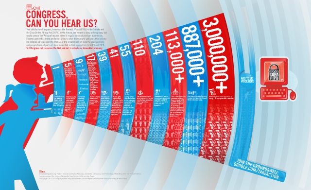 When I wrote Kill Switch a few months ago, there were some petitions linked to that had tens of thousands at the time and now as many as 150,000 (the Whitehouse.gov one got just over 100,000). And the petition at Avaaz is almost to 1.5 million. The grassroots opposition to these bills has been immense, more so in fact than other rather terrifying bills like NDAA, perhaps on account of the fact that SOPA and PIPA are directly aimed at internet freedoms.