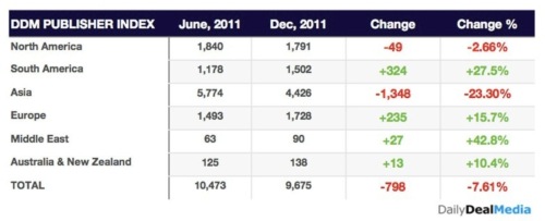 Overall, the total number of deal publishers dropped 7.61 percent in the second half of 2011.