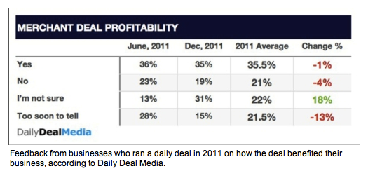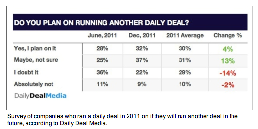 Daily Deal Media also surveyed merchants who used daily deal services in 2011, as well as 36,600 consumers who used daily deals last year.