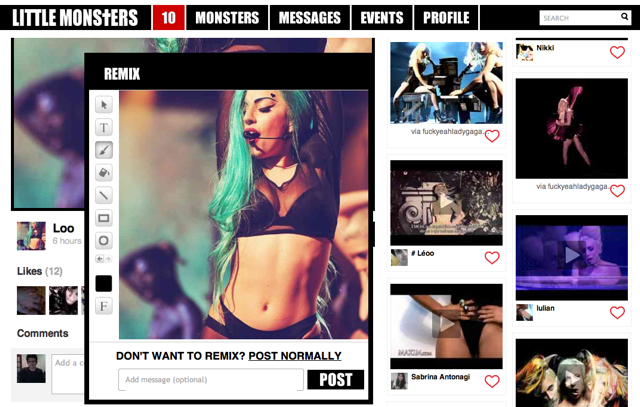 After initially logging into LittleMonsters, I was presented with a grid of tiles in an arrangement reminiscent of Pinterest. Pictures of Lady Gaga made up most of these tiles, though there was a smattering of other content — including a photo of me somewhere in there (the site creates a new post whenever someone joins the site). Clicking on one of these photos would bring it up in a larger size, and, in some cases, links to an accompanying article or video.