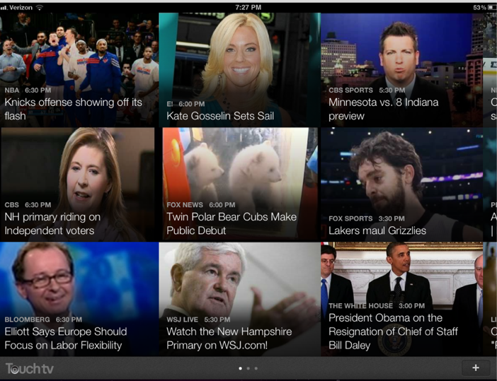 Custom designed for the iPad, Touchtv, which is a free app, aims to give viewers their own personal TV via the iPad to watch their favorite channels. SkyGrid has partnered with a number of networks including Fox, CBS, ABC, NBC, ESPN, OWN, E! and others to show specific content and programming.