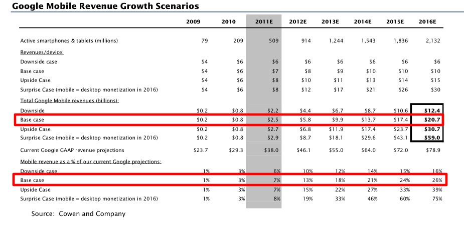 Google doesn’t regularly break out mobile revenues, so estimates are all we have to go by. Friedland’s model is below. He starts with an estimate of total active smartphones and tablets, applies a discount to estimate Google’s penetration, and then builds his model fron there. Friedland’s numbers are in line with other data from the company and elsewhere. Back in October, CEO Larry Page disclosed that Google’s annualized mobile ad revenue run-rate was $2.5 billion, which is what Friedland estimates for 2011. So Freidland might be a little aggressive there, but not by much.