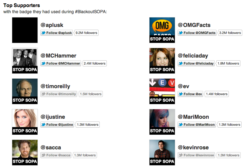 It was an amazing two weeks. We don’t intend for www.BlackoutSOPA.org to be an ongoing resource, although we’ll keep the technology alive for as long as people want to sport the badge (make support issues notwithstanding). On Sunday we turned the site into a call for finding more reasonable, balanced solutions with links to organizations in that spirit. We also memorialized the effort of the community: 87,204 people with combined 78 million connections. Spanning arts (Ashton Kutcher, MC Hammer) and technology (Evan Williams, Chad Hurley, Tim O’reilly). And even entire companies such as Pinterest came on board. Thanks web, we were proud and glad to serve you.