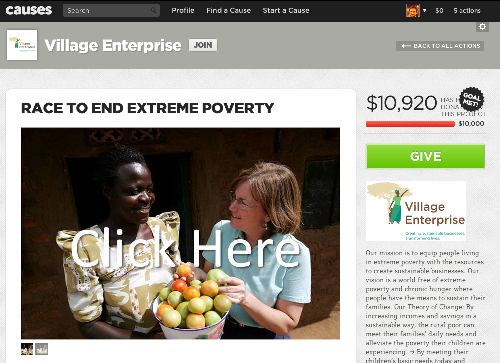 While the site is still full of purely altruistic causes, like Village Enterprises’ funding campaign to help support entrepreneurs in developing countries, Causes itself is also available for corporate clients who want to get in on the doing good thing. You know, the companies with lots of fancy-sounding efforts about Corporate Social Responsibility, that often produce less than clear results. Take AT&T, for example. The perennial under-performer in customer telecom satisfaction ratings has a few credible uses of Causes going on. One is a quiz that builds awareness around wasted cell phones — answer it and the company will donate $2 to The Nature Conservancy. Another use is a pledge not to text while driving, where the company promises to donate $2 to “educate drivers” for every action.