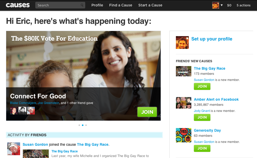 The design has been streamlined from the clunky-feeling app to focus on the key aspects of Causes today. A big rotating image shows major Causes across the top of the site, with recent activity by your Facebook friends underneath. The search bar, along with links to your profile and to finding or starting a Cause are located across the top navigation bar. To their right, you’ll find an image of yourself (your Facebook photo) as well as the amount of money you’ve raised and the number of actions you’ve taken. Below on the right-hand side, you’ll see a link to your profile, your friends’ new Causes, and the Causes raising the most money on the site.