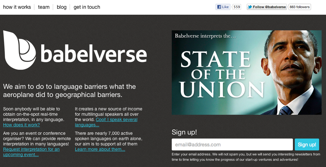 As to the State of the Union, Babelverse is hoping to translate the President’s words into what they hope to be as many as 7,000 languages and will be streamed here. (And English speakers with translation experience can volunteer their time during the address here.)