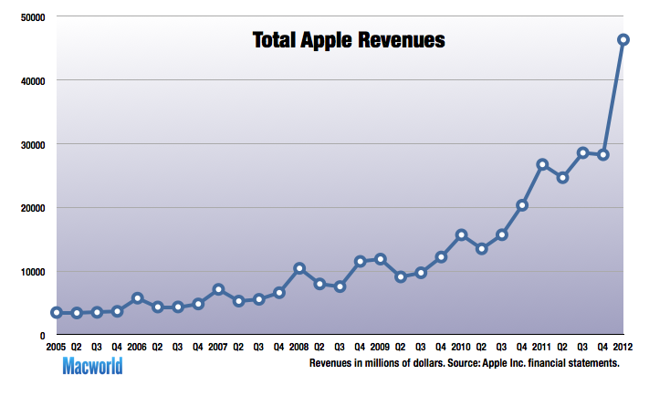It was only October of 2010 when Apple passed Microsoft in terms of revenue. At the time, Apple posted $20.34 billion — they’re well beyond double that now. Microsoft’s most recent quarter saw record revenue of $20.9 billion. Again, Apple came in at $46.33 billion.