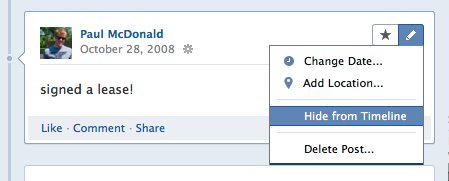Facebook explains how to hide posts you don’t want to appear on your Timeline (click the pencil to hide, delete or edit a post). You can also use the privacy drop-down to change who can see posts (e.g. “Only Me”).