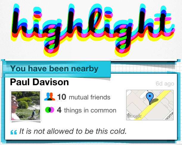 Checkins are not the future. They interrupt the moment and quickly become outdated. Highlight, a mobile app launching today, offers a better gateway to serendipitous meetups. All you do is download Highlight, turn it on, and let it run passively in the background. Then when you come within a few blocks of another Highlight user who’s your Facebook friend or that you have friends or interests in common with, Highlight sends you a push notification and lets you message them.