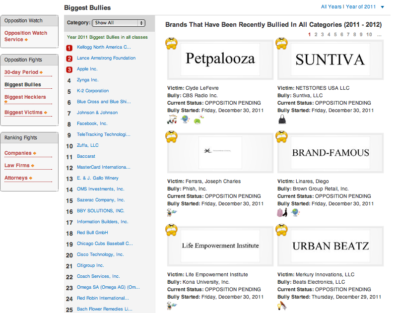 This new feature lets users search the USPTO’s database of trademark oppositions by year, category, the biggest bullies, victims, and “hecklers,” the latter of which includes those companies that file extended oppositions to trademark applications to slow down the review/approval process.
