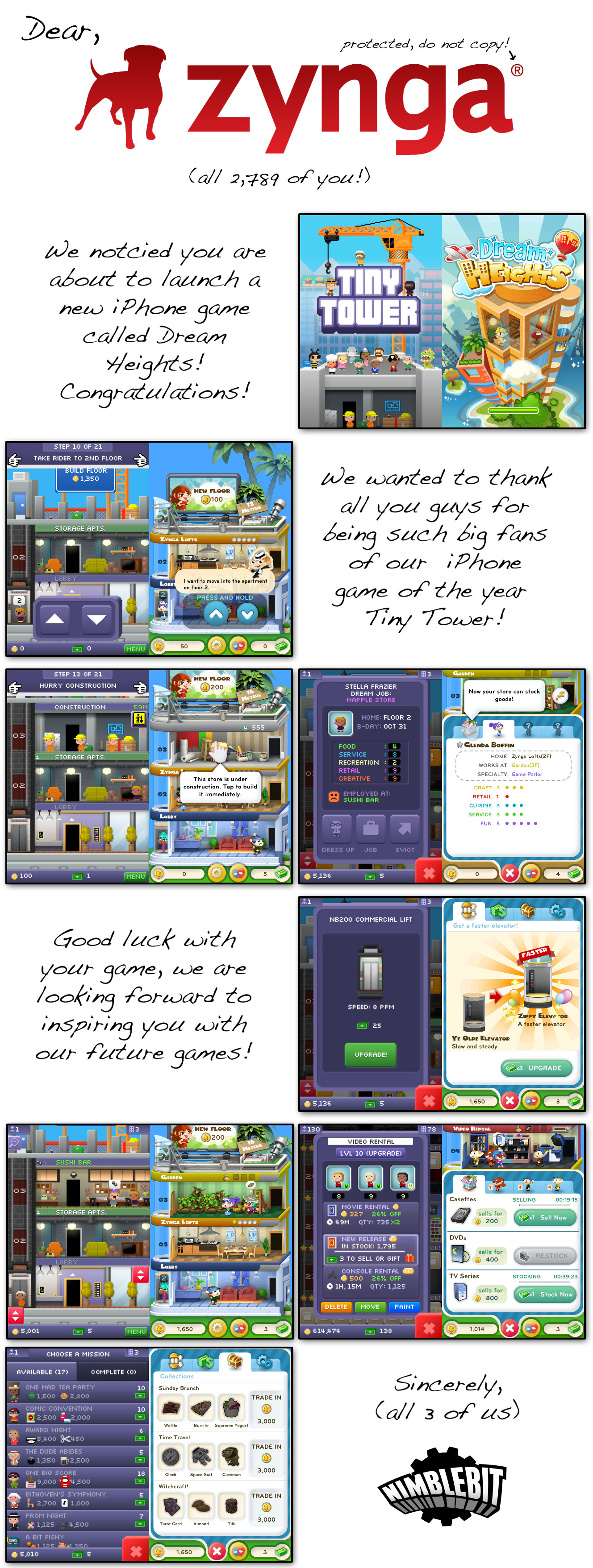 First: Zynga just launched a new iOS game, and it looks a lot like Tiny Tower. Second (and this one makes that first bit all the more interesting): Zynga allegedly tried to buy NimbleBit at some point in the past, but NimbleBit turned them down.