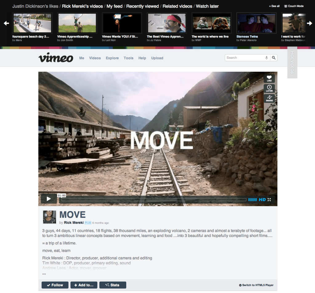 You can see the new emphasis on making videos front-and-center in the main player page for each video, where the videos have apparently doubled in width. Basically, every other element of the page has been pushed into the background. Vimeo provides you with links to related videos, but they’re actually hidden from sight until you drag down the menu from the top of the screen.