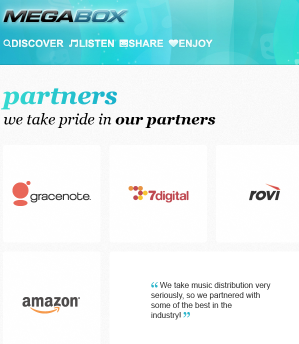 TorrentFreak first reported about the service in early December 2011. Megabox was just in beta at that time with listed partners of 7digital, Gracenote, Rovi, and Amazon. Megaupload was in a heated marketing battle with the RIAA and MPAA who featured Kim Dotcom in an anti-piracy movie (5:10 mark). The site had just sued Universal Music Group for wrongly blocking Megaupload’s recent star-studded YouTube campaign. Things were getting vicious in December but the quiet launch of Megabox might have been the straw that broke the millionaire’s back.
