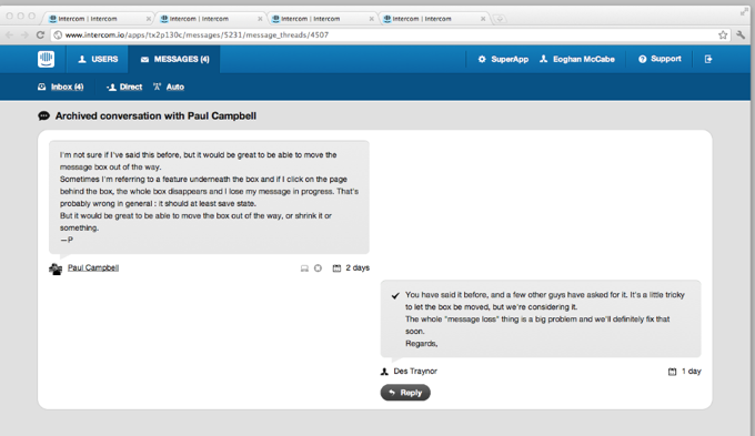 “Intercom brings real human relationships back into the picture for web businesses and their customers,” says McCabe. “As ‘software eats the world,’ in the words of Marc Andreessen, and all businesses become web businesses, genuinely personal and personalized customer service is the most effective, long-lasting way for companies to differentiate their offering and fight commodification.”