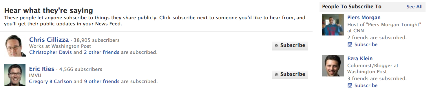 Though very late to the game, Facebook has been deeply incentivizing use of its asymmetrical Subscribe feature. Facebook makes it easy to accumulate Subscribers. It publishes a news feed story to your friends when you Subscribe to someone, and offers suggestions of “People to Subscribe to” in its sidebar (check out your personalized Subscription recommendations here). There’s an embeddable Subscribe button for websites available, and Facebook’s Comments Box plugin shows links to Subscribe to commenters.