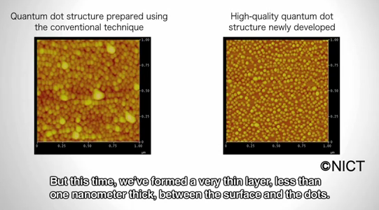 Usually when you fabricate quantum dots, you grow crystalline quantum dot particles, in nanometer size, on the semiconductor surface. But this time, we’ve formed a very thin layer, less than one nanometer thick, between the surface and the dots. By adding just this nanometer layer, we’ve be able to form high-quality quantum dots, without aggregation structures, at very high density.