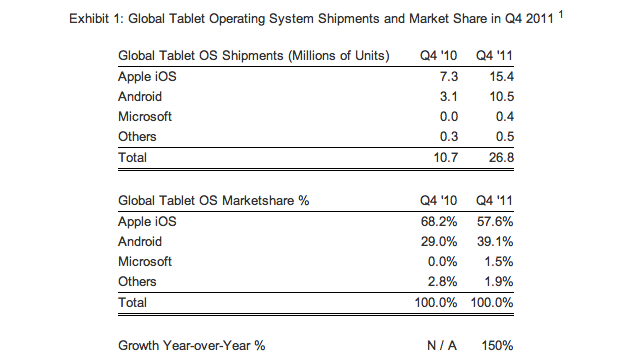 “Apple shipped a robust 15.4 million iPads worldwide and maintained its strong market leadership with 58 percent share during the fourth quarter of 2011. Apple shrugged off the much-hyped threat from entry-level Android models this quarter.”