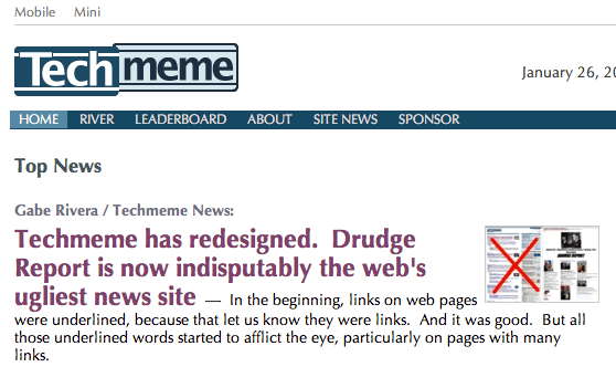 First off, links no longer have underlines, as founder Gabe Rivera says in his official post on the changes. This reflects a design preference seen on most of the web these days — except, as he notes on that old-school political news aggregator called the Drudge Report.