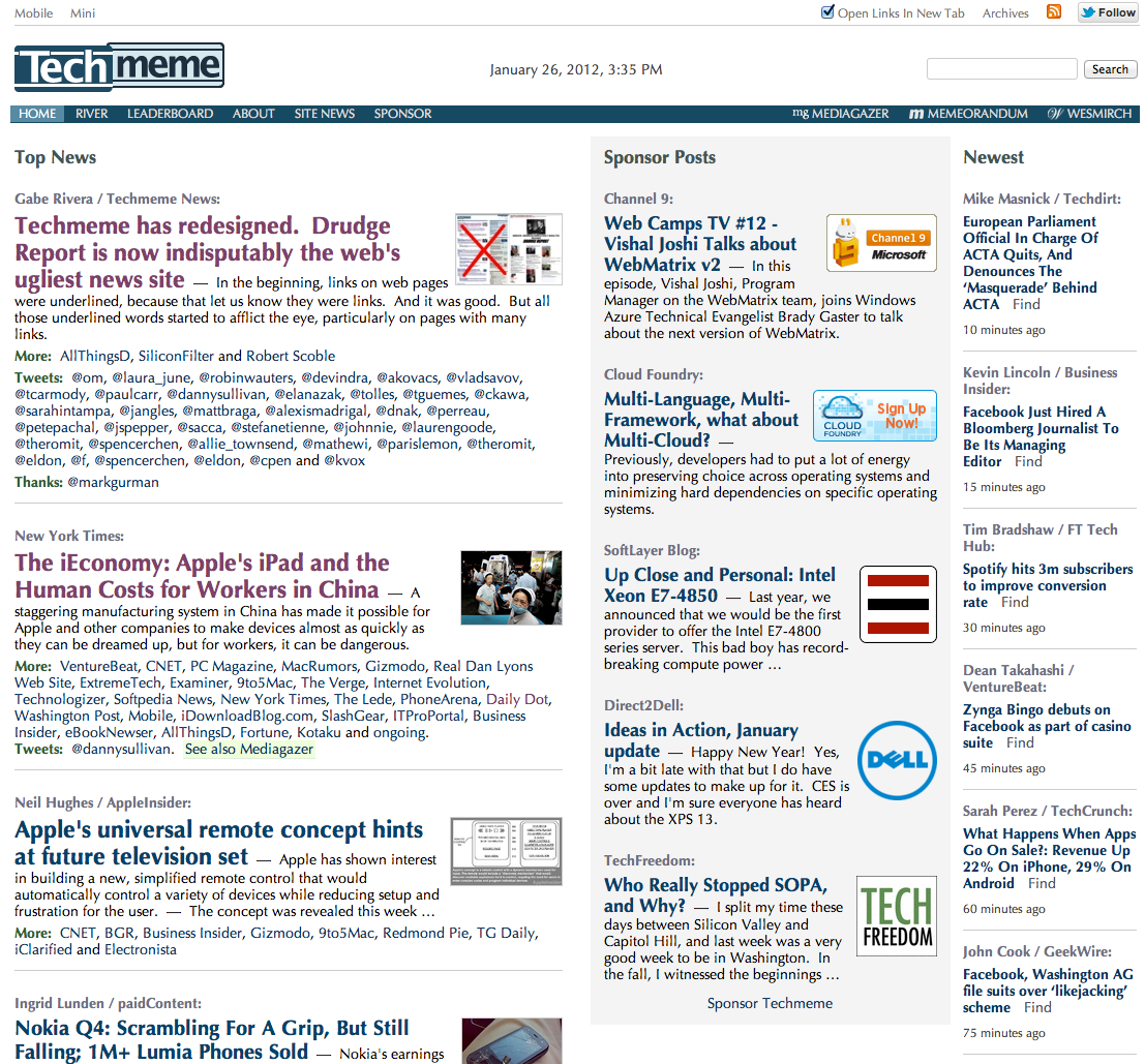 The new interface will eventually roll out to Mediagazer and other Techmeme sister sites, like gossip aggregator WeSmirch and my secret favorite, Drudge-replacing political aggregator Memorandum. But the refresh isn’t as urgent, Rivera says in his post. “Mediagazer in particular isn’t as afflicted with the uglies in the first place, given that its area of coverage leads to less link-heavy story clusters. But it will nonetheless benefit from a refresh. Techmeme’s redesign will not, however, extend into its past. One curious yet fun practice we’ve upheld here is that old archives maintain their old look.”