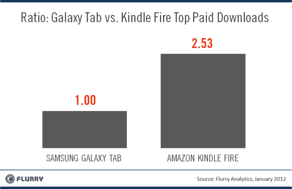 Next up, Flurry looked at the download numbers for 5 applications that were in the Top 10 on both the Android Market and Amazon’s App Store. To boil it all down: for every sale of one of these top apps to a Galaxy Tab owner, there were 2.53 sales to a Kindle Fire owner. Again, consider how much bigger the Galaxy Tab audience is (Flurry estimates that it’s at least double) — and yet, the Kindle Fire owners are buying more.