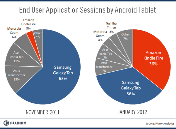 After launching in November, the Kindle Fire accounted for just 3% of application sessions. Just three months later, it’s at 35.7% — pretty much neck and neck with Samsung’s 35.6%.