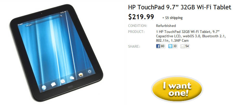 As of this post’s writing Woot has both models listed but the 16GB is already sold out. That leaves just the 32GB available. And at $219 it’s still a fine deal for a 9.7-inch dual-core 32GB tablet that can run Android. Of course only fanboys should apply. A general consumer would likely get more enjoyment out of a Kindle Fire or Nook Tablet. But perhaps you’re a starving coder, betting your future on webOS now that its going open-source — by all means, buy the TouchPad and lets never talk about it again.