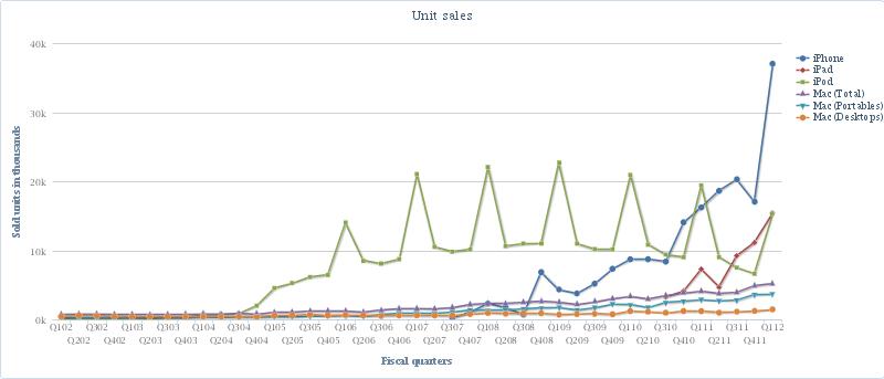 The quarter was driven by iPhone and iPad sales. And you can see that by looking at the blue and red lines, which show unit sales of each. iPhone sales went from 17 million the quarter before to 37 million. They more than doubled in a single quarter.