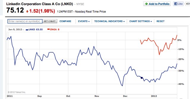 Another benchmark to look at is other social networking stocks that are already trading publicly, most importantly Zynga and LinkedIn. Both fell after their IPOs, but have been rallying so far this year ahead of earnings. (Zynga is finally above its $10 IPO price). Who knows where they will be in April or May, but a bull market for those stocks will mean a higher valuation for Facebook at its IPO. If they tank again, then Facebook’s valuation could also come under pressure.