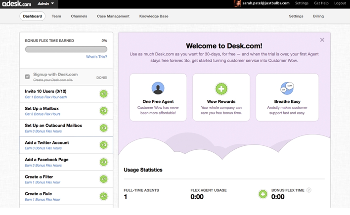 Salesforce is also touting the simple deployment of Desk.com for small businesses. With only four required fields, a company can register for its own social help desk in a matter of seconds. Desk.com also provides a checklist to help companies get started, and each task that a company works through earns the company flex hour credits that anyone in the company can use.