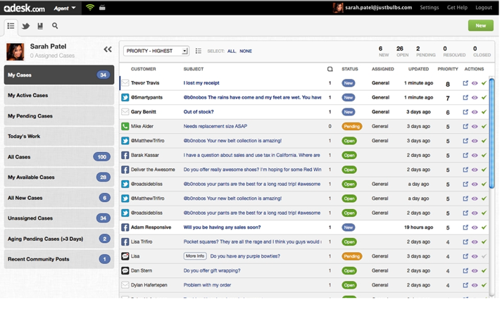 Built with social at its core, Desk.com allows small businesses work with and respond to customers over Twitter, Facebook and more. Basically, Desk.com integrates Twitter and Facebook customer service comments with other channels like email, phone and web within the agent desktop. Agents can also see data on how many cases customer service agents have opened, resolved, replied to, reassigned, or reopened—regardless of who was assigned the case. Desk.com includes twelve pre-built reports providing data for average handle time, time to first response, first contact resolution rate, and more.