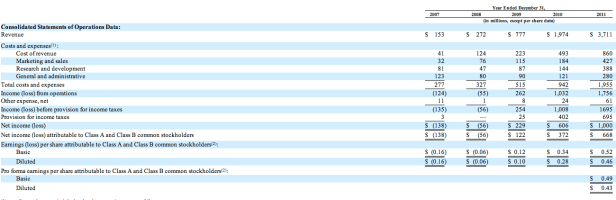 Facebook does reports loss for revenue numbers post 2006: It made $153 million in revenue in 2007, with a $138 million loss, $272 million in 2008 with a $56 million loss and was finally profitable in 2009 with a net income of $290 million on $777 million in revenue.