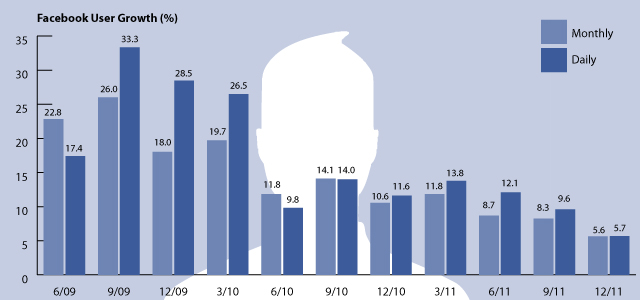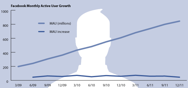 The problem, as the filing also notes, is that “our rates of user and revenue growth will decline over time.” A quick analysis of the worldwide monthly and daily active user counts in the document shows this phenomenon is already in full effect. From quarterly gains of above 20% for much of 2009, both monthly and daily increases fell to above 10% in 2010, and then to the single digits in 2011.