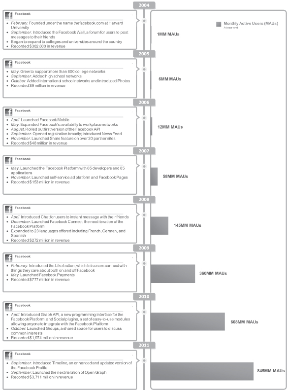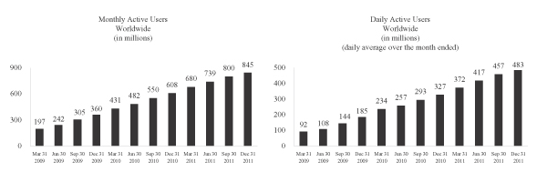 The numbers of monthly active users (MAUs) and daily active users (DAUs) presented in this prospectus are based on internal company data and we use these numbers in managing our business. We believe that our MAU and DAU numbers are reasonable estimates, and we take measures to improve their accuracy, such as eliminating known fictitious or duplicate accounts. There are inherent challenges in measuring usage across large online and mobile populations around the world. For example, there may be individuals who have multiple Facebook accounts in violation of our terms of service, despite our efforts to detect and suppress such behavior. As another example, applications on certain mobile devices may automatically contact our servers for regular updates with no user action involved, and this activity may cause our system to count the user associated with such a device as an active user of Facebook. We estimate that less than 5% of our estimate of worldwide DAUs as of December 31, 2011 could have resulted from this type of automatic mobile activity and that this type of activity had an even smaller effect on our estimate of worldwide MAUs. The impact of this automatic activity on our metrics may vary by geography, as mobile usage varies in different regions of the world. In addition, our data regarding the geographic location of our users is based on a number of factors, such as IP address, which may not always accurately reflect user location. We regularly review and may adjust our processes for calculating these metrics to improve their accuracy. In addition, our MAU and DAU estimates will differ from estimates published by third parties due to differences in methodology. For example, some third parties do not count mobile users.