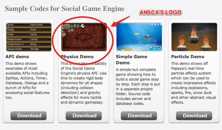 You can also see that the image above the “Physics Demo” on this page of PapayaMobile’s website (as of the time of writing) is an image from Ansca’s sample code packages. It even has the Ansca logo.