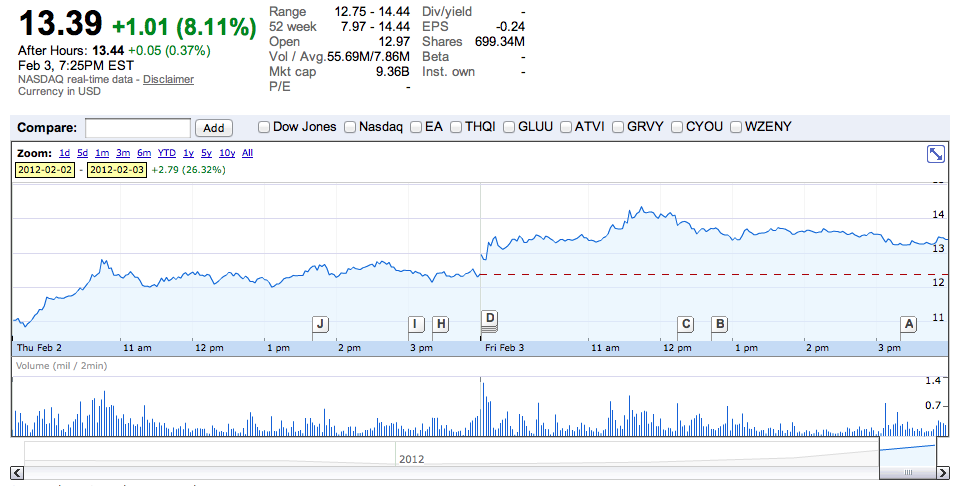 In the two days since, Zynga’s stock has gone up more than 26%, to close at $13.39 this evening.