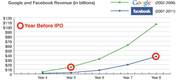 If you chart Facebook’s revenues for the past five years and compare them to Google’s for the five-year period preceding its IPO (see below), a truer picture emerges of each company’s size at similar points in time. You need to compare Facebook as a 5-year-old to Google as a 5-year-old.