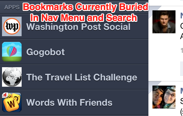 But Facebook has been pulling its punches. It has hundreds of millions of daily active mobile users who first see the news feed where these bookmarks are being tested. Facebook says similarly styled bookmarks on the web interface’s games canvas page have been proven to drive traffic.