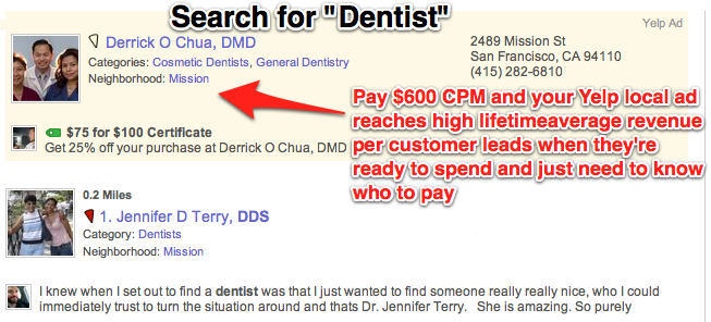 Yes, these ads are expensive, especially for low-end restaurants. But for lawyers, dentists, jewelers, and mechanics with a high lifetime average revenue per customer, turning someone searching for their services on Yelp into a loyal customer is no rip-off, it can drive big ROI.