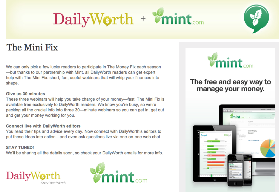 Obviously, both Mint and DailyWorth are hoping that this partnership and its new programs will be a win-win for both businesses. Mint.com will now have direct access to DailyWorth’s community of 225K subscribers, a ready-made audience (of new customers) looking to better manage their finances, while DailyWorth boosts its own offerings by giving its readers direct access and education on how to use Mint’s straightforward personal finance tools.