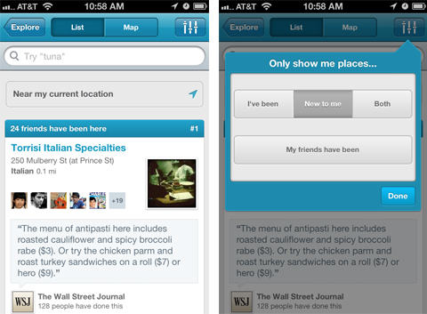 Starting today, you’ll now be able to use the new filter button (at the top right on iOS or bottom right on Android) to narrow your search results by options like “New to me,” places you’ve already been, “Both,” or, alternatively, you can choose to see those places your friends have tried.