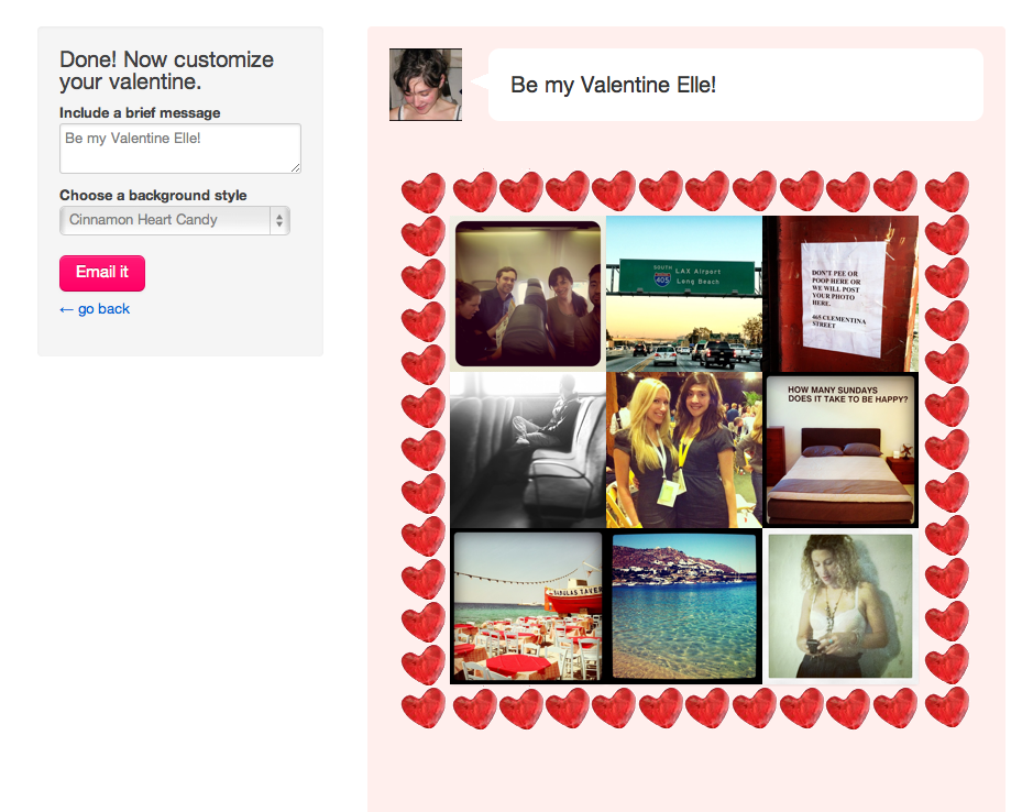 Her goal? To create what is now Lovestagram, a way to take the Instagram photos you’ve shared with a specific person and turn them into an e-Valentine. “Several months ago, I was brainstorming a gift for two friends who had recently gotten engaged. I wanted to find Instagram photos they had in common, and it was tough!”
