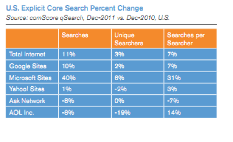 comScore also reports that the general search market continued to grow at double-digit rates in 2011, posting an 11-percent increase in 2011. Apparently, this momentum was driven by a 3 percent gain in unique searchers and a 7 percent gain in the number of searches per searcher.