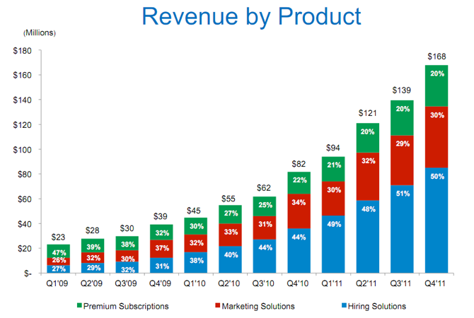 Revenue from Marketing Solutions products totaled $49.5 million, an increase of 77% compared to the fourth quarter of 2010 (and represented 30% of total revenue in the fourth quarter of 2011, compared to 34% in the fourth quarter of 2010). Premium Subscriptions revenue totaled $33.3 million, an increase of 87% compared to the fourth quarter of 2010 (and was 20% of total revenue in the fourth quarter of 2011, compared to 22% in the fourth quarter of 2010).