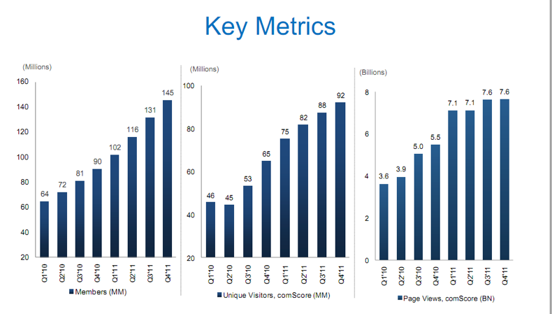 Weiner said that member engagement was at record levels in 2011, and the site passed the 150 million milestone. Member page views grew 77 percent in the fourth quarter and unique member visits to LinkedIn in Q4 grew 67% year over year. 60 percent of LinkedIn members are located outside of the U.S. Mobile account for 15 percent of total visits to the site.